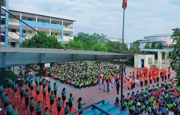 Ngay sau đó !important;, lễ chào cờ diễn ra long trọng và trang nghiêm. Dưới lá cờ đỏ sao vàng tung bay trong nắng mùa thu, CBGVNV và HS cùng hát vang “Quốc ca” và “Hành khúc Hội khỏe Phù Đổng” với niềm tự hào vô tận.