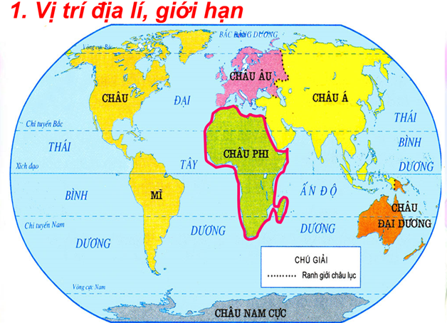 Ở hoạt động này HS được quan sát và xác định được vị trí của châu Phi trên quả địa cầu cũng như trên bản đổ thế giới. Sau khi đã xác định được vị trí, học sinh sẽ tiến hành thảo luận nhóm đôi trong thời gian 2 phút để tìm hiểu rõ hơn vị trí địa lí, giới hạn của châu lục này
