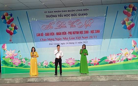 Trong không khí vui tươi, phấn khởi của tuần lễ chào mừng ngày Nhà giáo Việt Nam 20/11. Sáng thứ 2 đầu tuần ngày 14-11-2022, trường tiểu học Đức Giang tổ chức Hội diễn văn nghệ chào mừng ngày 20/11. Mở đầu chương trình các thầy cô giáo trong BGK : Thầy Đỗ Huấn, Cô Thanh Tâm, cô Mẫn Mẫn đã gửi tới các thầy cô giáo, các bậc phụ huynh, cùng toàn thể các bạn học sinh bài hát “Người giáo viên nhân dân” – Nhạc và lời Hoàng Vân.