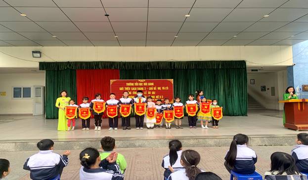 Sau phần giới thiệu cô hiệu trưởng mới, cô Tổng phụ trách nhận xét các hoạt động nề nếp trong tuần 24, nhắc nhở học sinh có ý thức hơn không đùa nghịch chạy nhảy trong giờ ra chơi, vệ sinh lớp học sạch sẽ hơn, không ăn quà vặt. Cô TPT khen những bạn nhặt được tiền biết trả lại người mất, tuyên dương các lớp có thành tích xuất sắc trong tuần vừa qua. Đại diện BGH, cô hiệu trưởng Lê Thị Chung đã lên trao cờ thi đua cho các lớp có thành tích xuất sắc trong tuần 24.