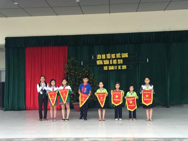 Sáng ngày 11-02-2019, sau 10 ngày nghỉ Tết các bạn học sinh của trường Tiểu học Đức Giang nô nức đến trường để được gặp gỡ bạn bè và thầy cô giáo. Thứ 2 đầu tuần này cũng như mọi tuần khác 100% các lớp duy trì nếp tổ chức chào cờ . Sau phần nghi thức chào cờ Đội, hát Quốc ca, Đội ca, hô đáp khẩu hiệu là phần đọc điểm thi đua tuần 22 và trao cờ cho các lớp có thành tích cao.