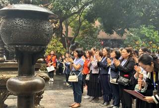 !important; Đúng 6h40 phút, các em học sinh có mặt tại trường để tập trung, bạn nào cũng trong tâm thế háo hức mogn chờ mặc dù trời lất phất mưa phùn. 07h00’ xe ô tô và hướng dẫn viên của Công ty Du lịch Ấn Tượng Việt Nam có mặt tại trường đón thầy cô và các bạn học sinh khởi hành tới khu di tích Đền Đô (Từ Sơn, Bắc Ninh). Tới nơi, các em học sinh cùng các thầy cô tập trung trước sân Rồng để tham dự lễ dâng hương. Đây là nơi thờ tám vị vua nhà Lý có công với đất nước. Cô hiệu trưởng Lê Thị Chung cùng các thầy cô giáo và học sinh lên dâng lễ và thắp hương. Sau đó các thầy cô và các con được nghe thuyết minh tìm hiểu về Đền Đô.