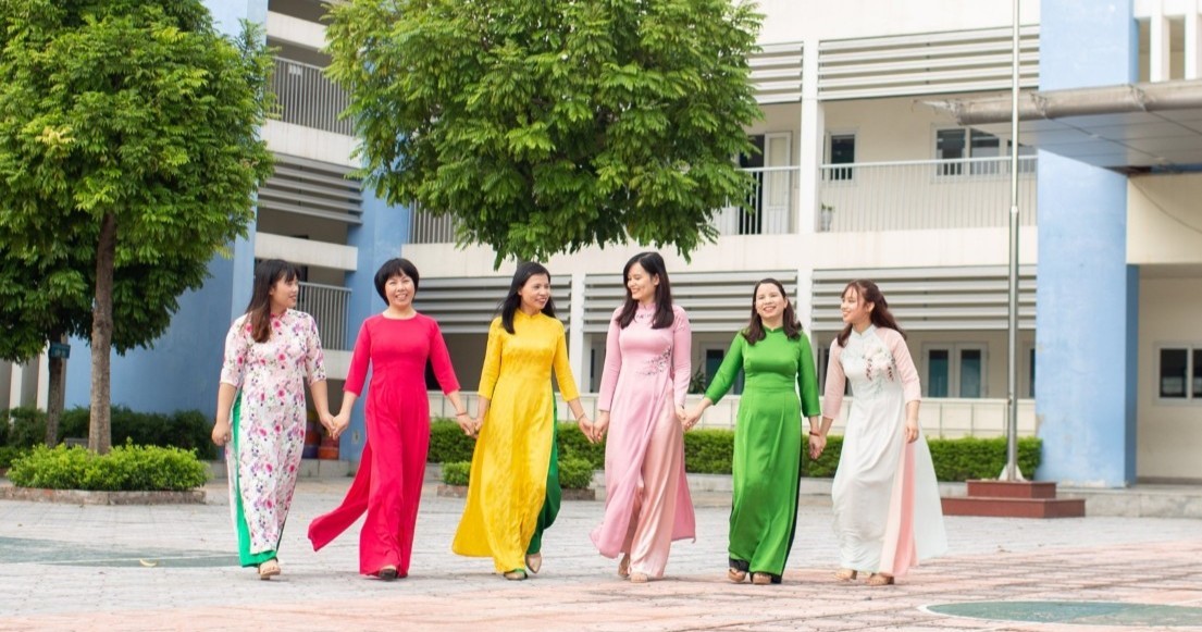Hình ảnh các thành viên tổ 4 trong trang phục áo dài dự thi: Duyên dáng áo dài - Giáo viên TH Đức Giang nhân dịp chào mừng ngày Phụ nữ Việt Nam.